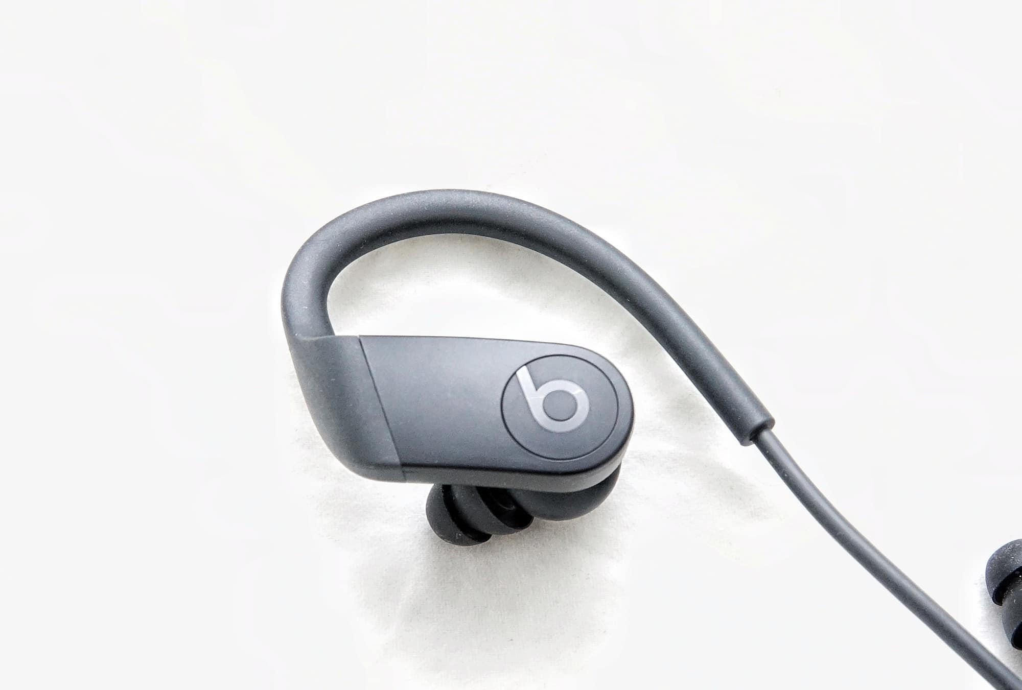 Controlling the Powerbeats corded variety is a little different from what we experienced in the cordless Powerbeats Pro. While the Pro model offered controls on either side — for left -or right-handed individuals — the corded Powerbeats offers most of the controls on the right, with a clickable “b” button for pause and playback, while a volume rocker sits above. The power button is found on the left, though it seems to be a little less responsive than we’d like, and doesn’t always switch the earphones on and off as quickly as other Beats earphones.