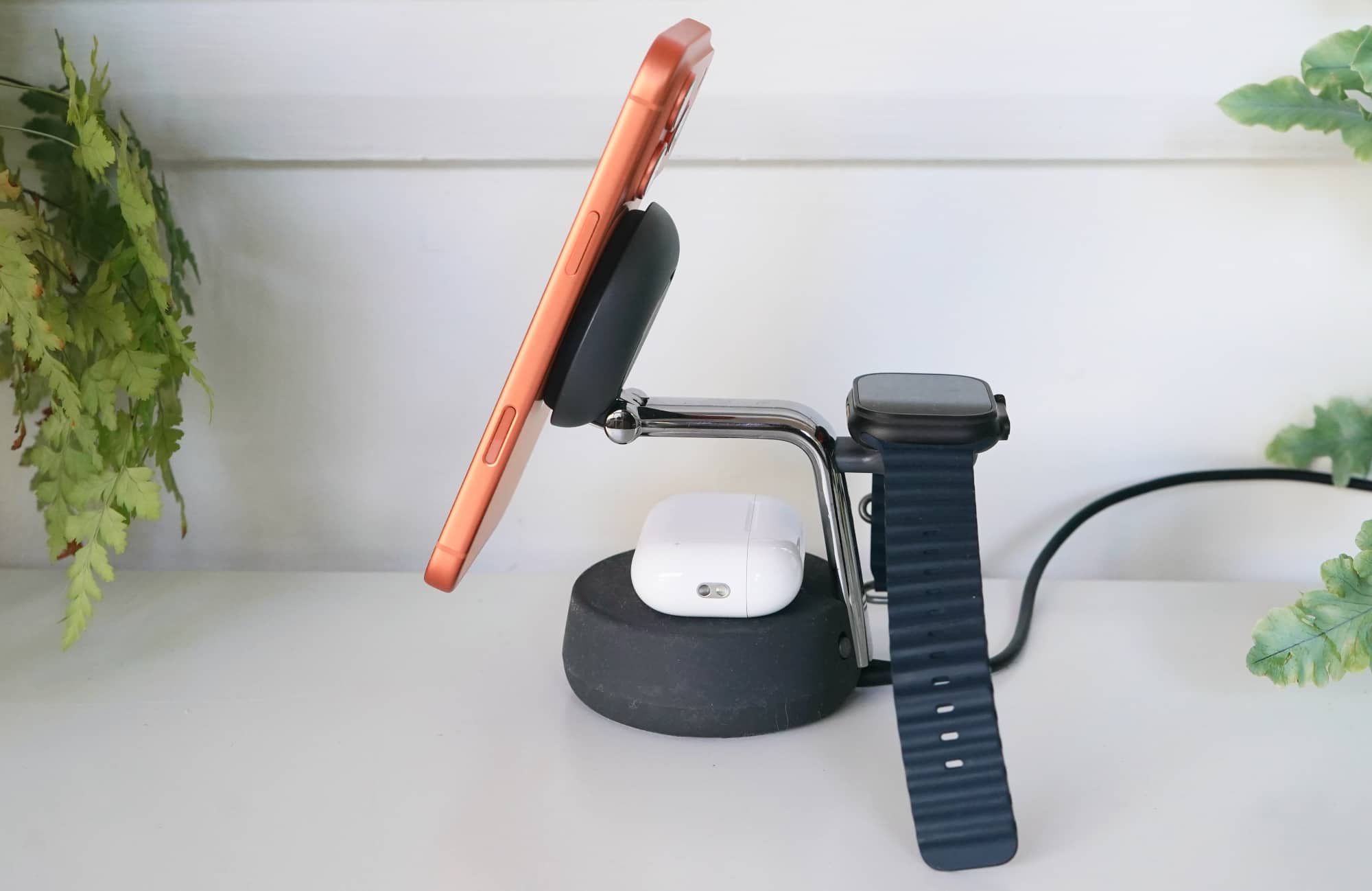 You simply attach your phone using the magnetic pad, rest your Apple Watch on the charger, and leave your wirelessly rechargeable earphone case on the base beneath it all.