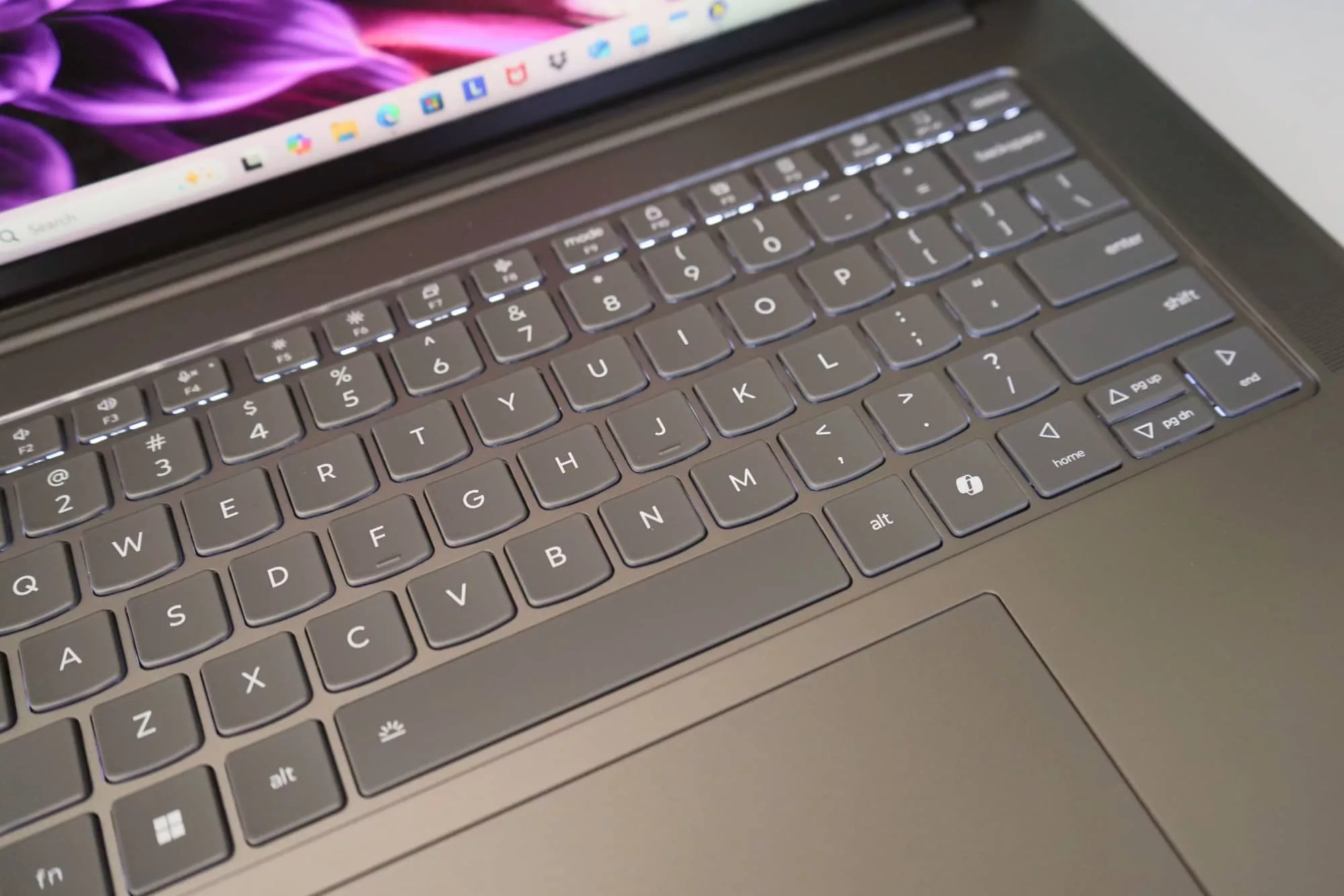 It’s a comfortable-enough keyboard with most of what you’d need: a set of function keys up top, a couple of levels of keyboard backlighting (with an auto settings), and a small set of directional keys squished on the right side.