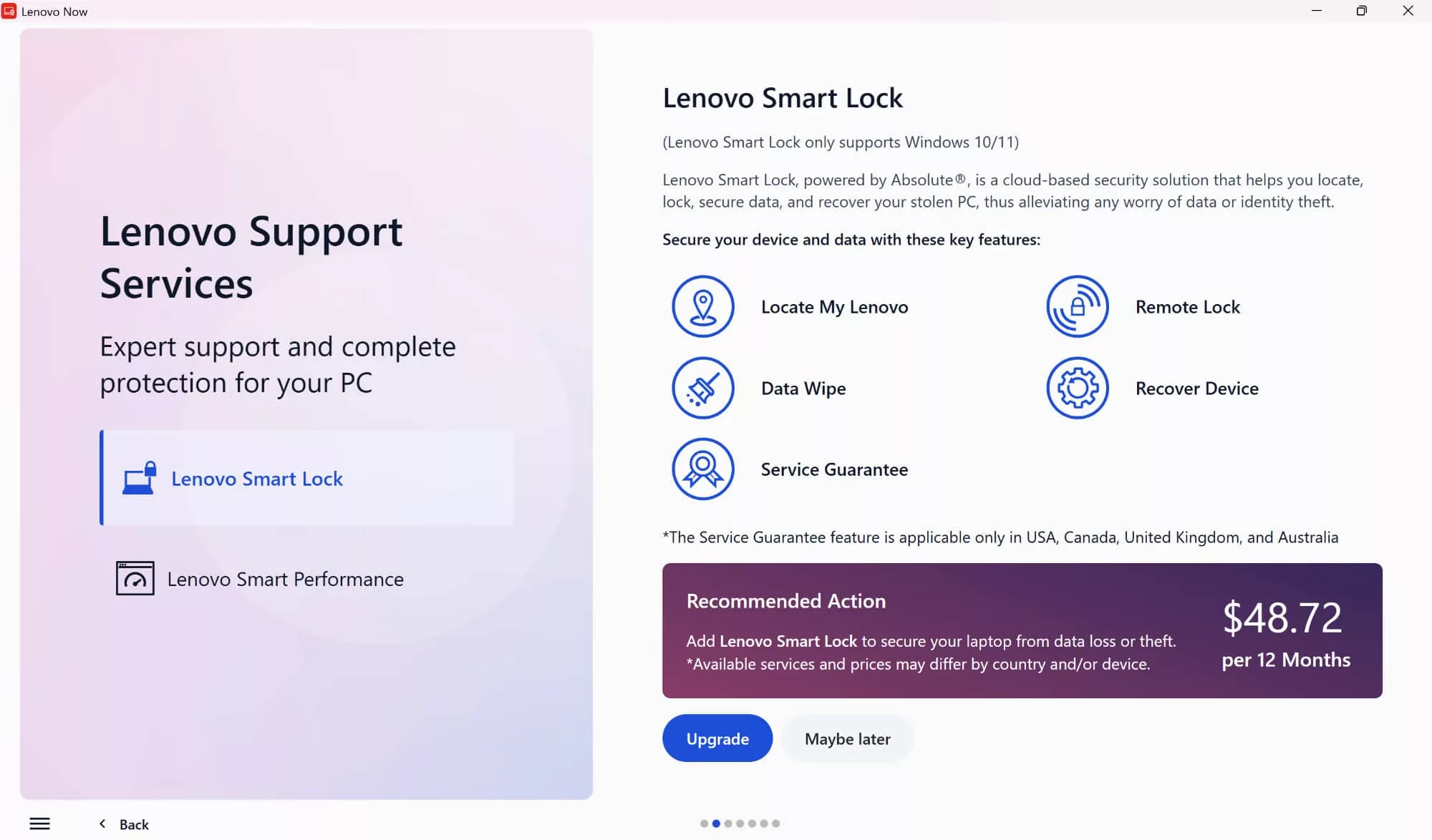 Setting up the laptop using the included “Lenovo Now” app basically just shows ads for Amazon Music, YouTube, McAfee, and even a Lenovo Smart Lock service for security of physical hardware that costs a good $50 per year. It doesn’t really matter what you pick for the laptop use, either; personal, work, gaming, and education all yield the same response: buy some more apps and services, people.