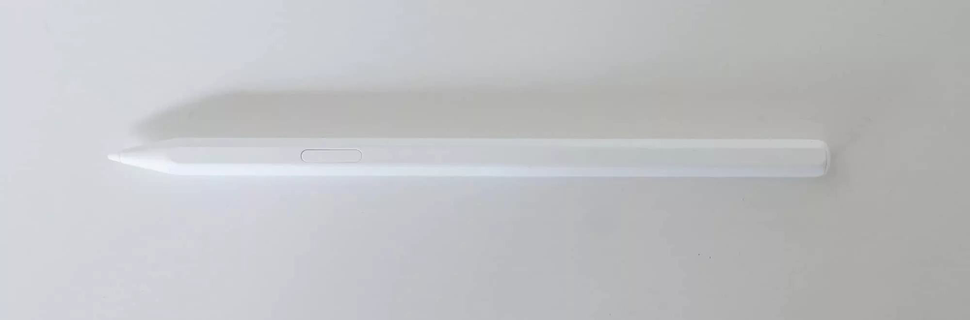 If you can imagine a classic school-ready 2B pencil, but in white and with a stylus and button, this is what you’d have.